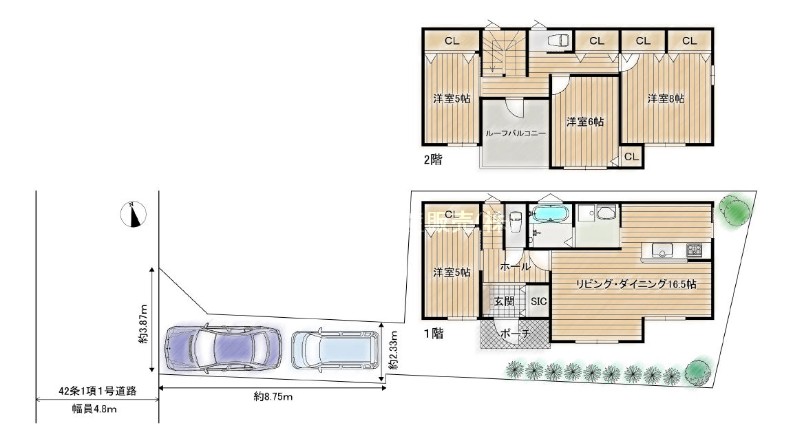| 土地面積(有効) | 116.09m2 ( 35.11坪 ) | 接道 | 西 4.8m(幅員) 3.87m(接面) | |||||||||||||||