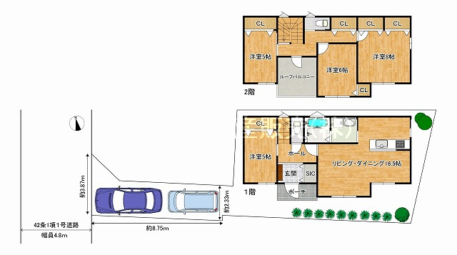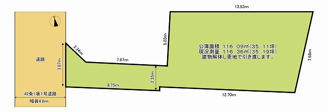 土地面積(有効) | 116.09m2 ( 35.11坪 ) | 接道 | 西 4.8m(幅員) 3.87m(接面) | |||||||||||||||