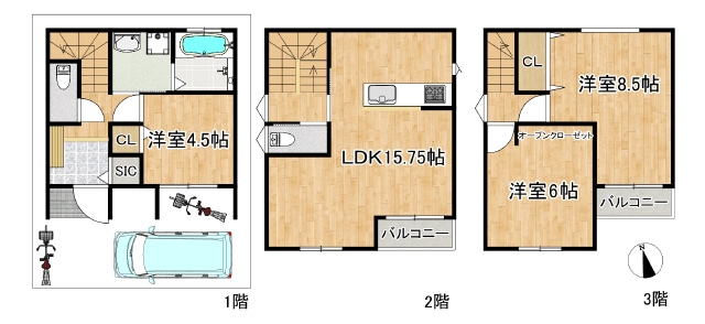| 間取詳細 | (1F)洋4.5、(2F)LDK15.7、(3F)洋8.5、洋6 | 地目 | 宅地 | |||||||||||||||